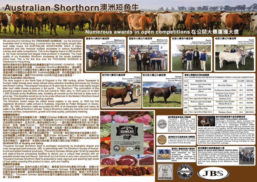 這品種在澳洲享譽盛名及在大師級的烹飪比賽及牛展中連續數年獲得冠軍大獎。其肉質超越所有本地的其他優質品種。故事始於18世紀的英格蘭東北部劃成功地培育出短角牛,此為世界上最受追捧的牛肉之一。這種血統成為現代短角牛品種的關鍵基因,該品種以其出眾的品質而聞名。當今的短角牛以其出色的母性及生育能力、溫馴性格、生長能力及肉質(尤其是大理石花紋)而聞名。