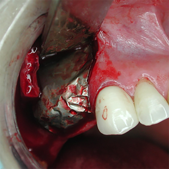 Pure titanium membrane of ultra-thin thickness of about 10 microns (0.01mm). Totally inert, biocompatible and non-biological thus removing the fear of disease transmission from collagen of bovine source. It allows ease of handling and adaptation over the operative site. Because of its mouldability, it does not require pin or screw fixation, thus avoiding the risks of pin or screw swallowing or aspiration. Excellent clinical performance in guided tissue regeneration. Resistance to infection after exposure. Primary wound closure is not necessary. No tissue reaction or wound infection.